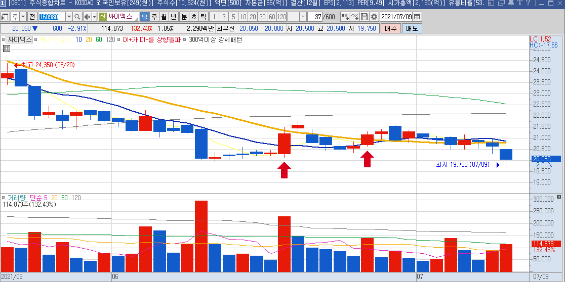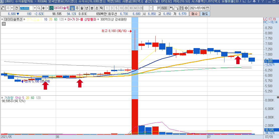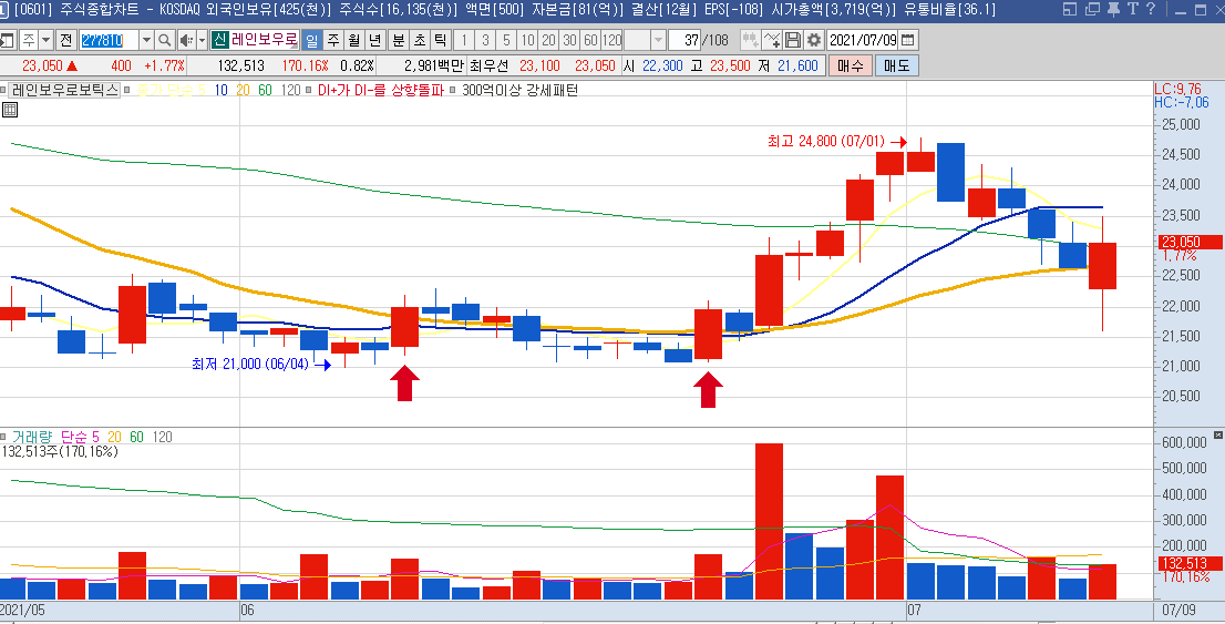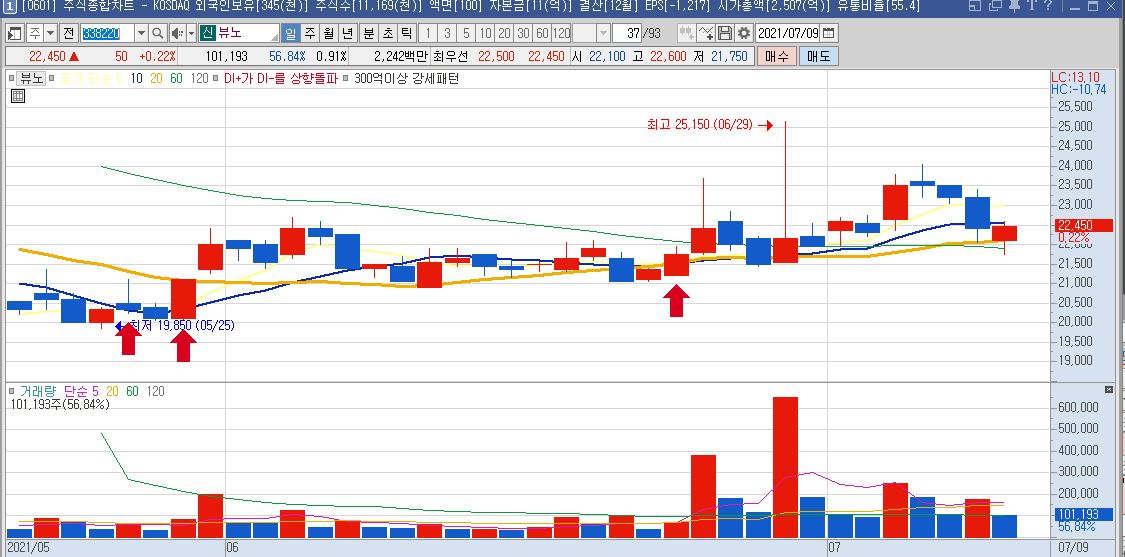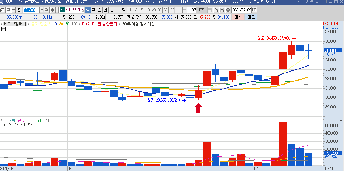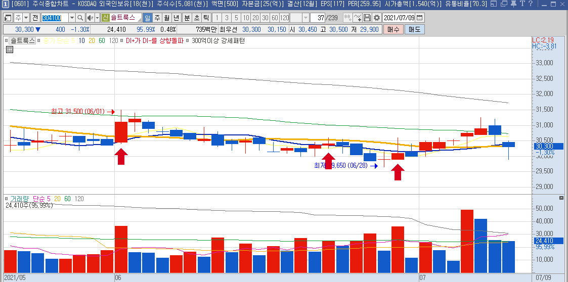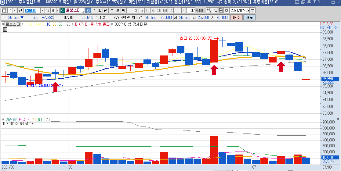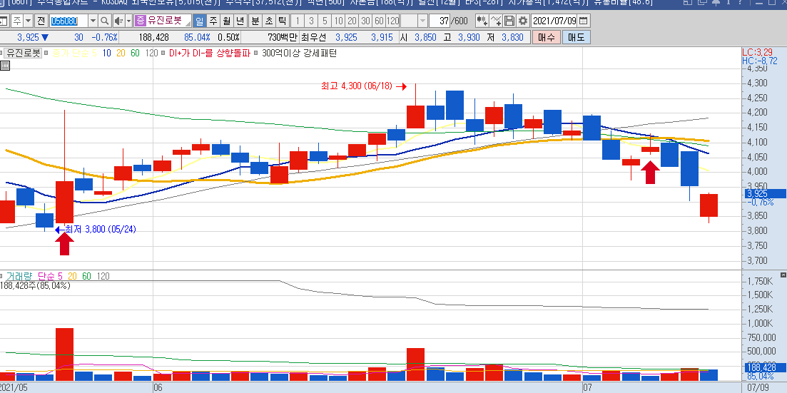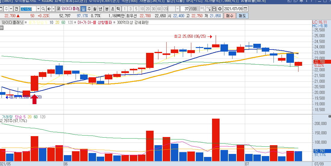 일봉차트만 봐도 하루에 나오는 등락폭이 크기 때문에 단타들이 많이 이용하는 종목으로 보이며,