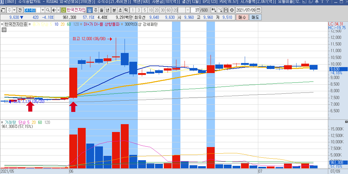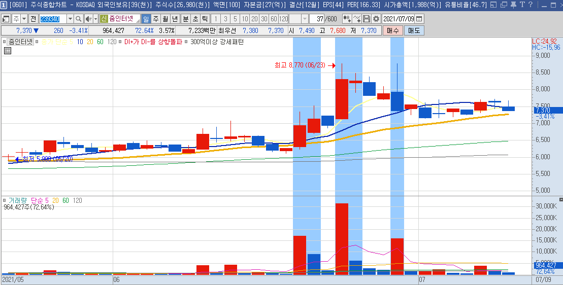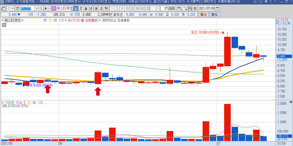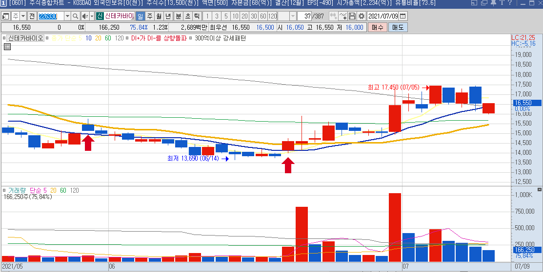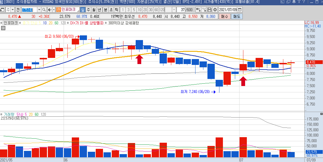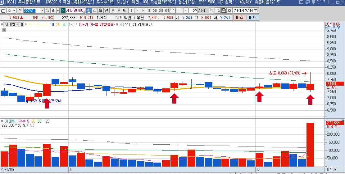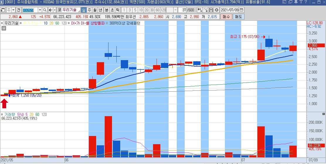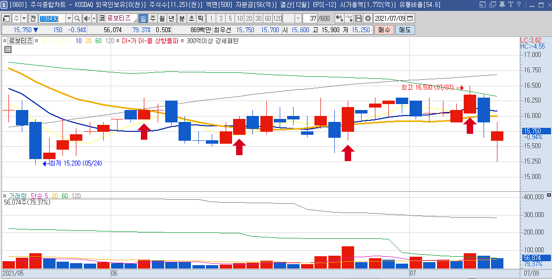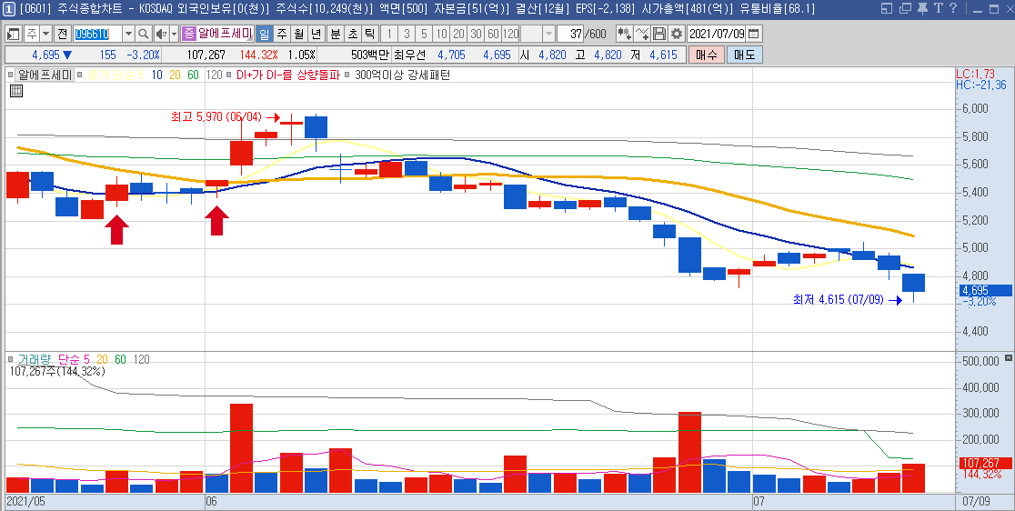 일봉차트만 봐도 하루에 나오는 등락폭이 크기 때문에 단타들이 많이 이용하는 종목으로 보이며,