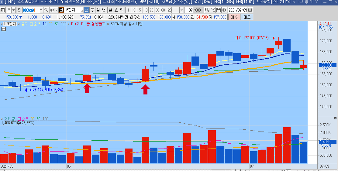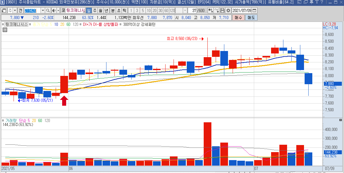 최근 강한 상승 이후 주가가 버티지 못하고 하락중에 있습니다만,