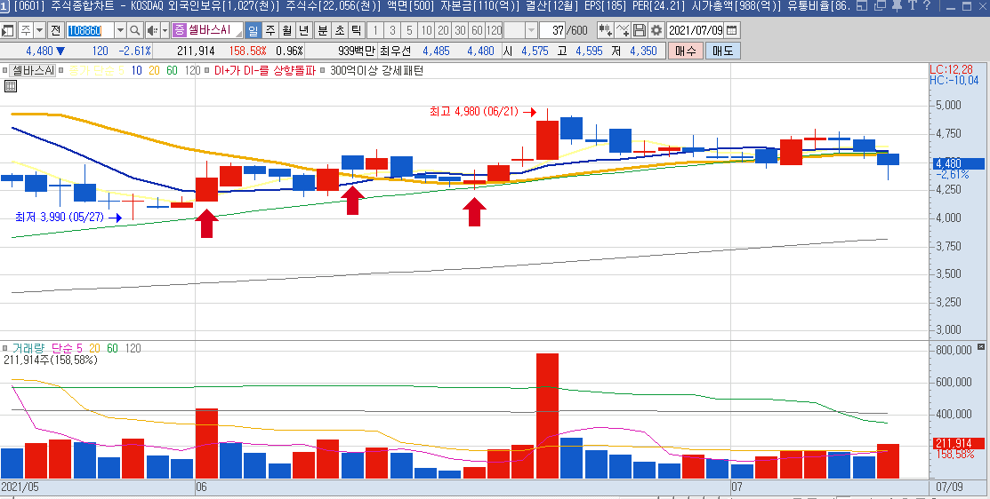 최근 강한 상승으로 우상향중이며, 지수하락시에도 큰폭으로 하락하지않고 버텨주었으며,
