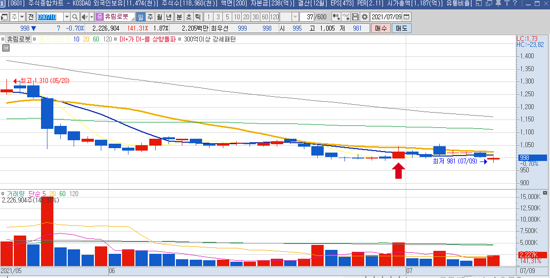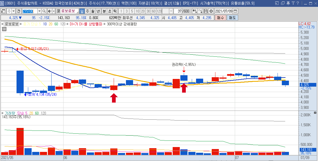 차트상으로써는 20일선을 깨고 하락하고 반등하였지만, 거래량이 많지 않아 추천하지는 않습니다.