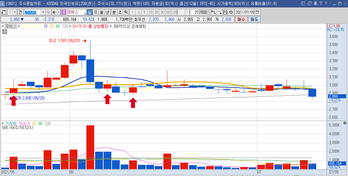 10일선과 5일선에서 놀고있기에 아마 횡보할것으로 보이는 차트입니다.