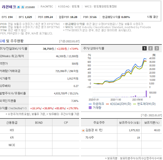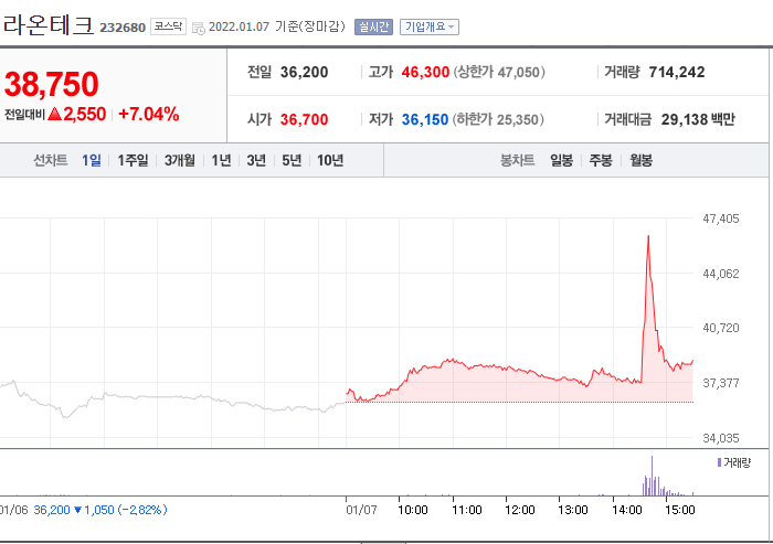 라온테크 주가 38,750원으로 7% 상승한 상태입니다.