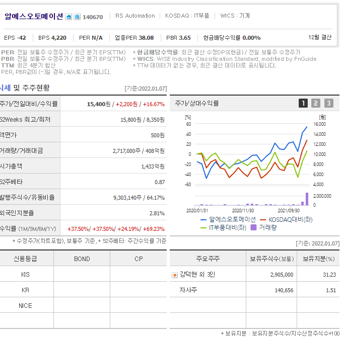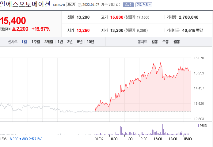 알에스오토메이션 주가 15,400원으로 마감이 되었으며,