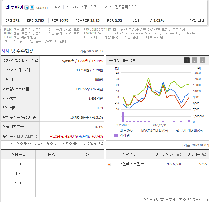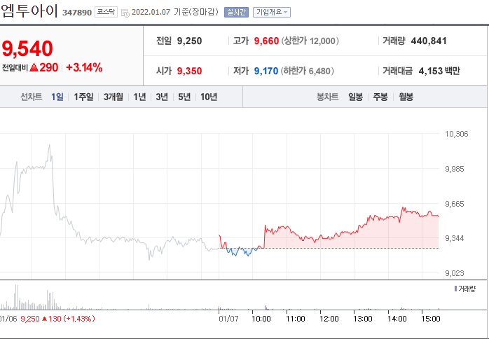 엠투아이 주가 9,540원으로 3% 상승하고 마감이 되었습니다.