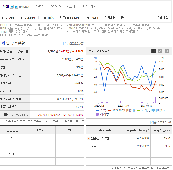 스맥 주가 2,200원으로 14%가 상승하여 마감이 되었으며