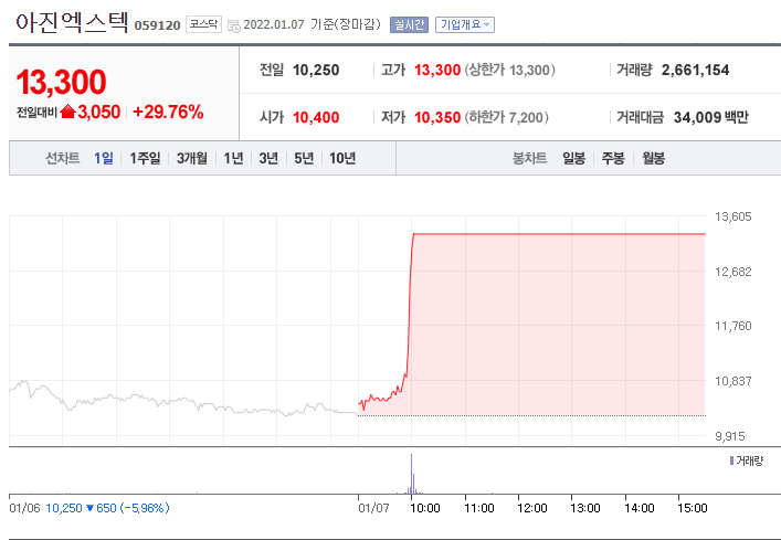 아진엑스텍 주가 13,300원으로 상한가에 도달하였습니다.