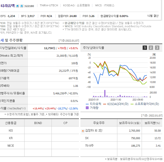 티라유텍 시가총액은 697억원이며, 발행주식수는 5,466,250주 입니다.
