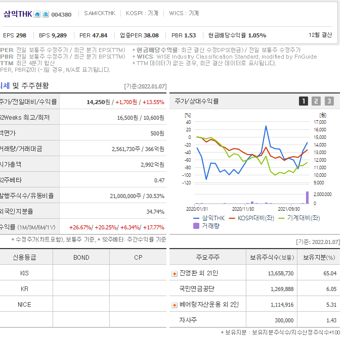 삼익THK 시가총액은 2,992억원이며, 발행주식수는 21,000,000주입니다.