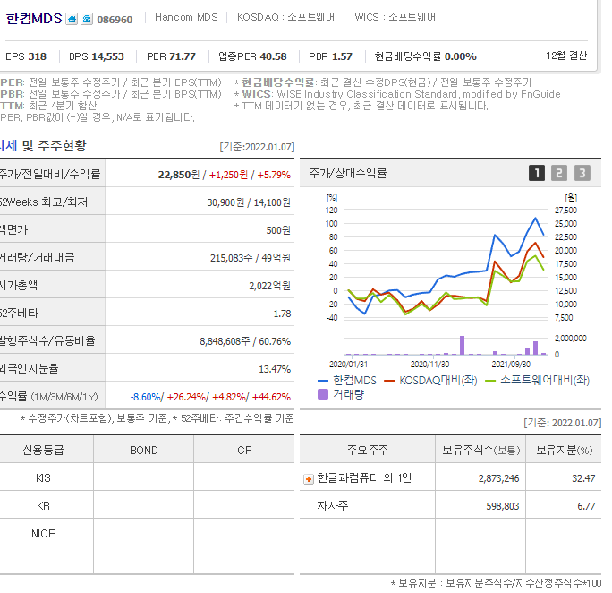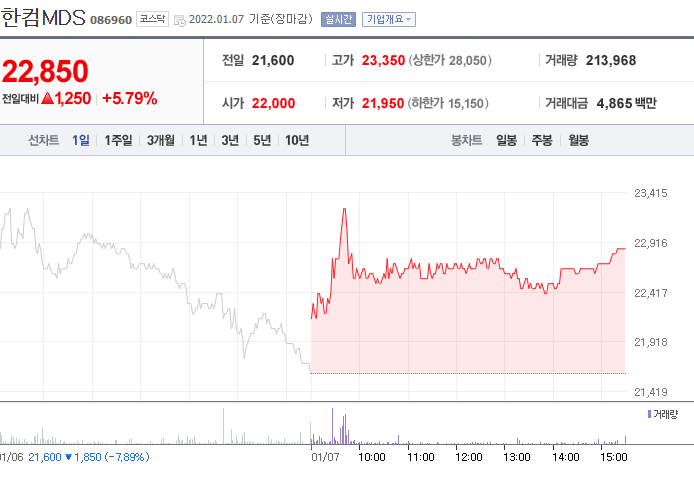 한컴MDS 주가 22,850원입니다. 한컴MDS의 경우 스마트팩토리와 관련이 없는것으로 보여지는데