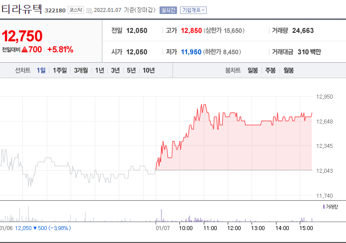 티라유텍 주가 12,750원으로 5%정도 상승하여 마감이 되었습니다.