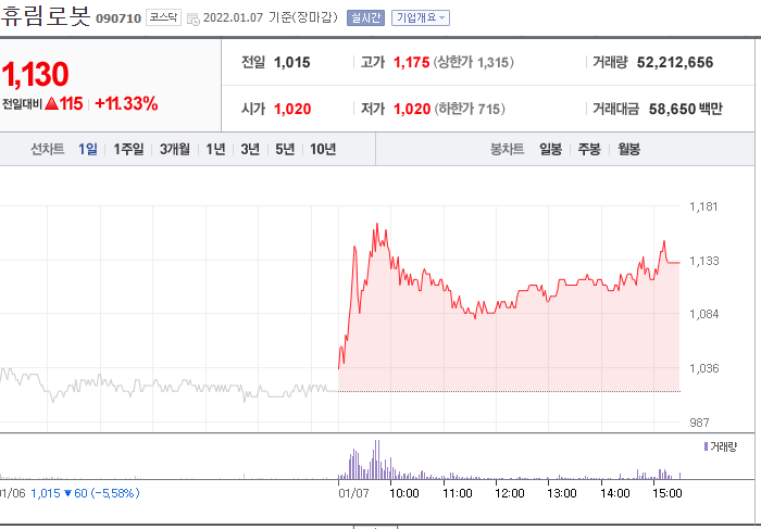 휴림로봇의 경우 휴림로봇 주가 1,130원으로 상승하여 마감이 되었습니다.