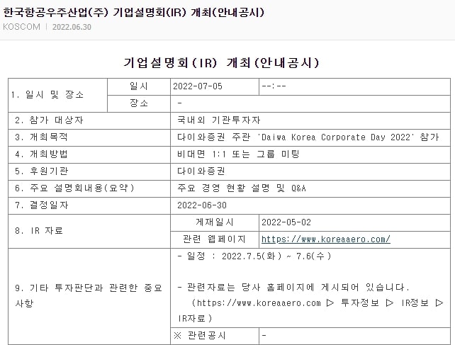 6월 30일 한국항공우주 IR을 개최하면서