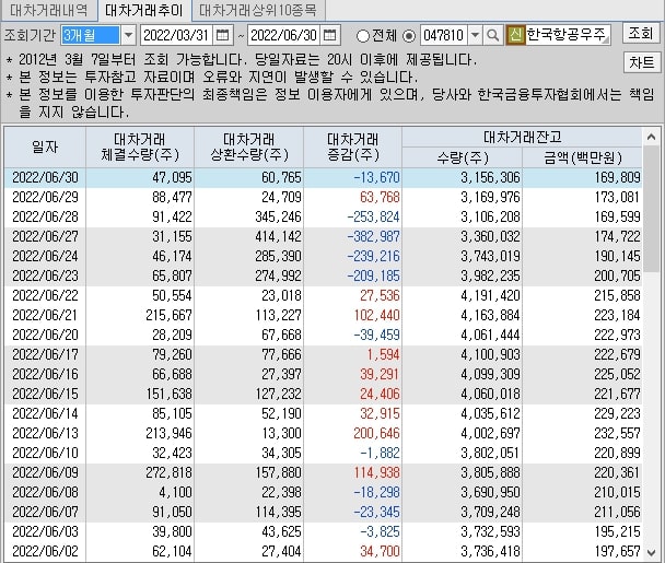 한국항공우주 대차거래잔고 현황입니다.