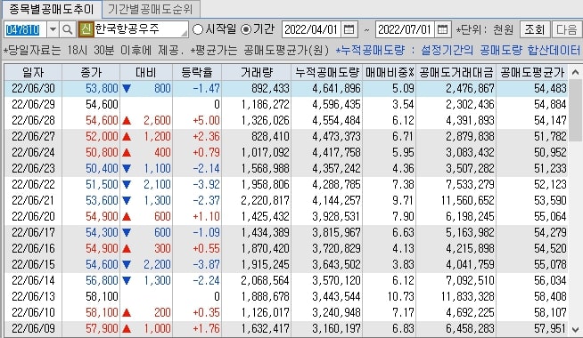한국항공우주 공매도 추이에서는 공매도가 증가된 모습도 볼 수 있습니다.
