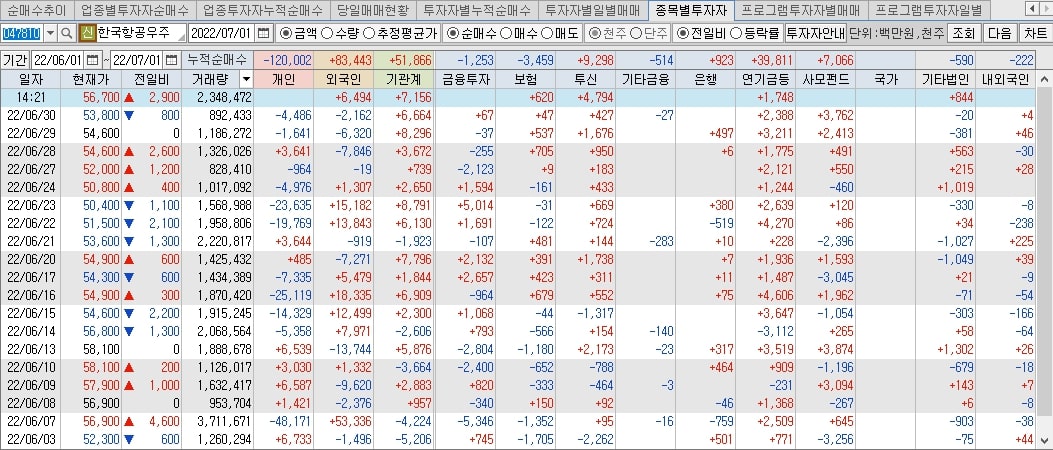 한국항공우주 투자자별 매매동향에서는