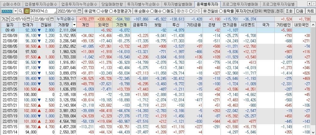 SK하이닉스 대량 매도가 나타나고 있으며, 100만주가 넘는 매도세가 나타나면서