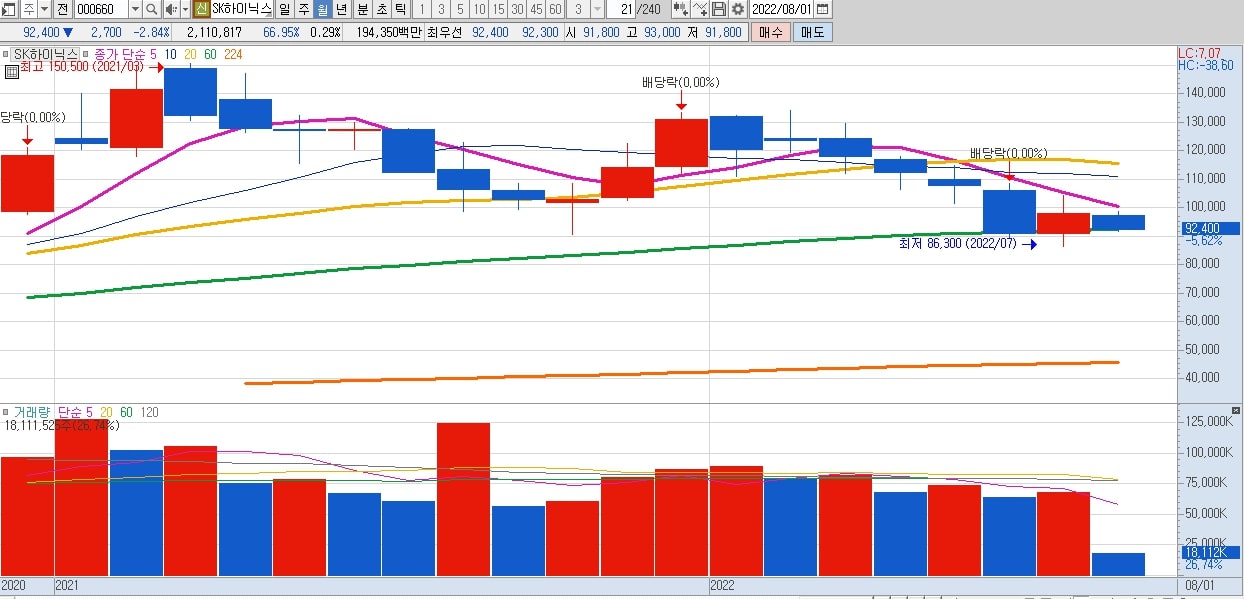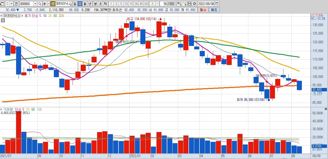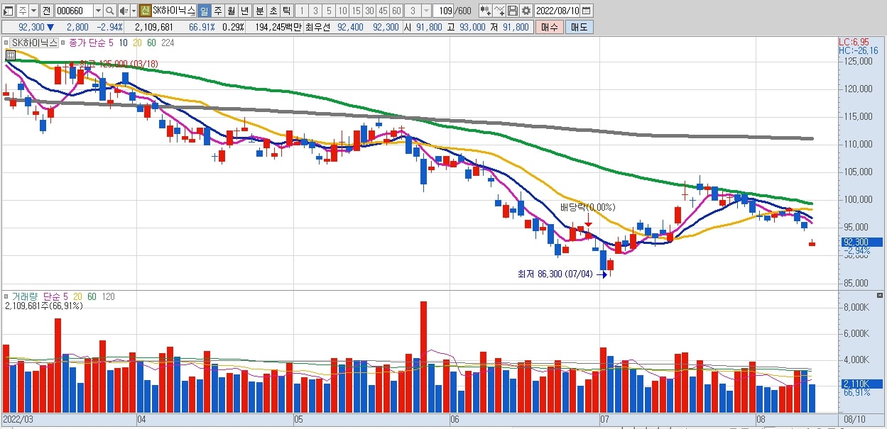 SK하이닉스 최저가 86,300원의 최저가 갱신을 하였습니다.