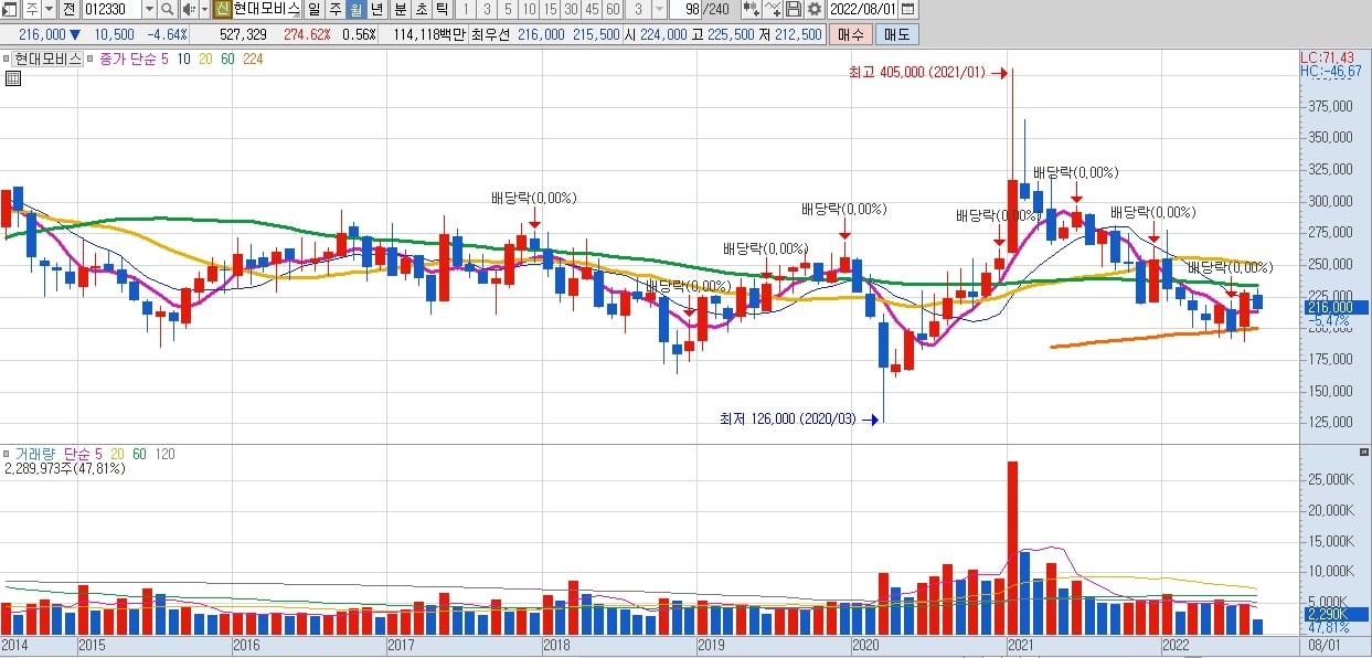 현대모비스 주식 시세 목표가 월봉차트에서는