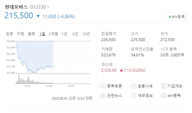 현대모비스 주가 215,500원으로 현대모비스 주가 하락이 나타나고 있습니다.