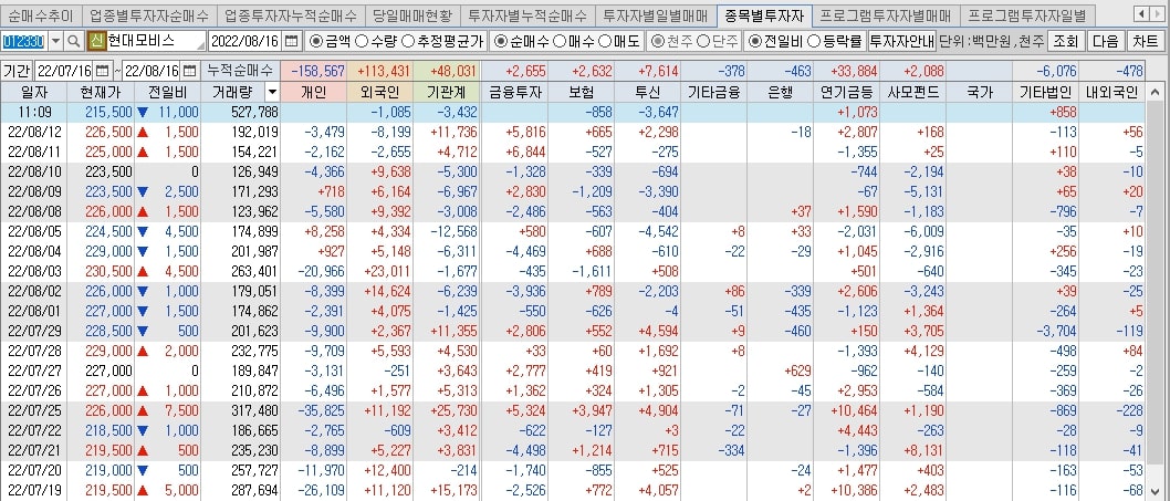 현대모비스 투자자별 매매동향 입니다.