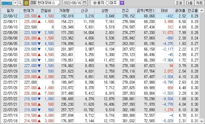 현대모비스 대차거래잔고 증가와 공매도 증가가 이뤄질듯 합니다.